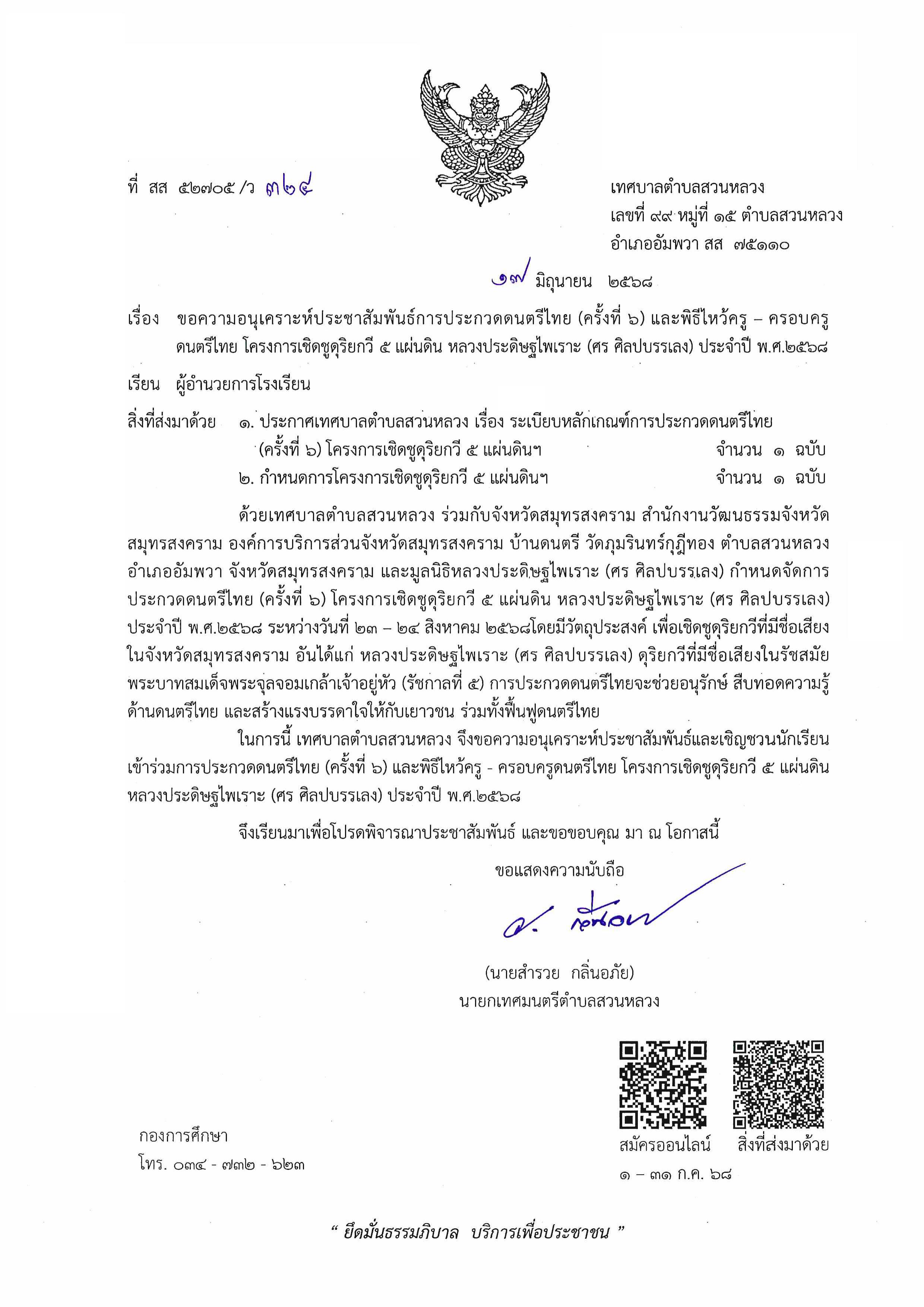 เทศบาลตำบลสวนหลวงขอเชิญชวนนักเรียนเข้าร่วมการประกวดดนตรีไทย (ครั้งที่ 6) และพิธีไหว้ครู – ครอบครู ดนตรีไทย โครงการเชิดชูดุริยกวี 5 แผ่นดิน หลวงประดิษฐไพเราะ (ศร ศิลปบรรเลง) ประจำปี พ.ศ.2568 ดังนี้