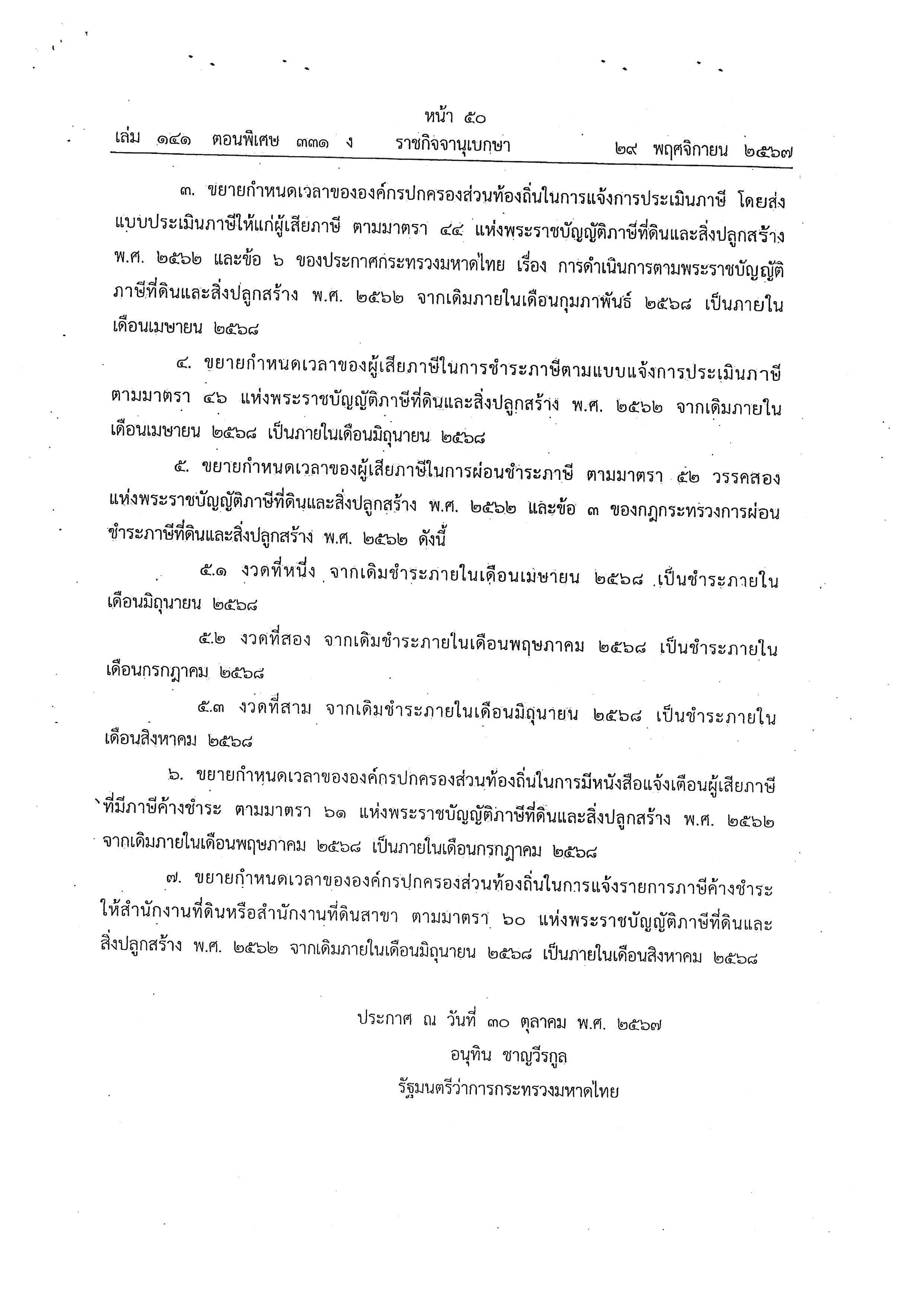 ขยายกำหนดเวลาดำเนินการตามพระราชบัญญัติภาษีที่ดินและสิ่งปลูกสร้าง พ.ศ.2562 ประจำปี พ.ศ.2568